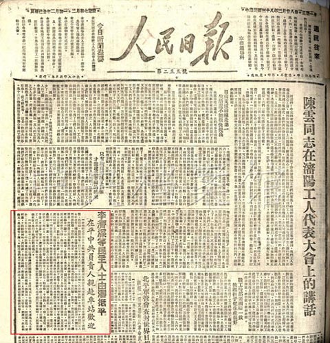 4.1949年2月28日,《人民日?qǐng)?bào)》關(guān)于李濟(jì)深等民主人士由沈陽抵達(dá)北平的報(bào)道