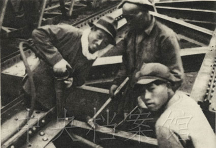9. 1950年,天津制鋼廠生產(chǎn)模范徐敬生利用廢材做了三百四十多種器材,圖為他和工人們?cè)谧鲂碌鸟R丁爐鋼架