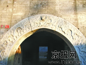 岱王廟坐落在盧溝橋西側(cè)的橋西街5號(hào),坐北面南。遠(yuǎn)遠(yuǎn)望去,岱王廟建造的十分精巧,醒目。當(dāng)?shù)匕傩账追Q它為大王廟或大廟。岱王廟的山門和戲樓,平面呈T字形布局,銜接緊密,融為一體,是一座上下二層硬脊歇山頂磚木結(jié)構(gòu)的建筑。歷經(jīng)滄桑歲月,房脊兩頭的吻獸早已蹤跡皆無(wú),只有東西山墻頂部的鈴鐺排山,保留的還算完整。整座建筑用青磚砌成,磨磚對(duì)縫,對(duì)仗工整,呈現(xiàn)了清時(shí)期的建筑風(fēng)格。山門的一層中央是石制拱形券門,券門兩旁是各一長(zhǎng)方形豎窗。石制拱形券門刻有石雕,門首弧頂上方雕刻著探首的夔龍,在片片的祥云中翻轉(zhuǎn)騰挪,吞云吐霧。夔龍兩側(cè)各刻有兩條玩耍的蟠龍,像眾星捧月一樣游弋在探首的夔龍身邊。最為有意思的是,石制拱形券門兩側(cè)下部的石雕上,各刻有一只在水中山石間吐水的小獸,造型奇特,形態(tài)逼真,顯現(xiàn)出十分生動(dòng)有趣的畫面,給整座石雕增添了一筆頑皮的色彩。整個(gè)券門上的石雕布局嚴(yán)謹(jǐn),古樸典雅,雕工灑脫,莊重中不失諧趣,顯示出那個(gè)時(shí)代工匠們的高超技藝。