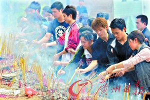 昨天的葉氏祭祖現(xiàn)場,記者發(fā)現(xiàn)一個(gè)有趣的現(xiàn)象,前來祭拜的葉氏后人不單有南番順口音、粵西口音、客家口音、普通話,甚至連祭祀的儀式也都不一樣。其中來自廣東信宜的葉氏后人在祭祀的過程中還有專職人員吹嗩吶,來自東莞的后人則在燒豬頭上掛朵大紅花,而來自花都、清遠(yuǎn)的葉氏后人更是舞起了麒麟,十分有意思。