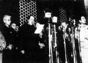 周恩來(lái)總理和中蘇友協(xié)會(huì)長(zhǎng)宋慶齡、副會(huì)長(zhǎng)劉少奇到前門車站歡迎。團(tuán)長(zhǎng)是蘇聯(lián)著名作家、蘇聯(lián)作協(xié)總書(shū)記法捷耶夫,代表團(tuán)中還有著名作家西蒙諾夫與好些有名的藝術(shù)家及高級(jí)干部,全團(tuán)約有40多人。當(dāng)時(shí),因?yàn)榭陀^環(huán)境和條件的限制,未能邀請(qǐng)外國(guó)的政府代表團(tuán)或政黨代表團(tuán)參加。這個(gè)蘇聯(lián)的民間代表團(tuán),與已經(jīng)在京的朝鮮人民代表團(tuán),加上一個(gè)來(lái)解放區(qū)訪問(wèn)的意大利共產(chǎn)黨中央委員斯巴諾,是有幸出席開(kāi)國(guó)大典的僅有的外國(guó)人了。蘇聯(lián)的代表團(tuán)剛剛安頓下來(lái),下午就興奮地登上了天安門城樓。