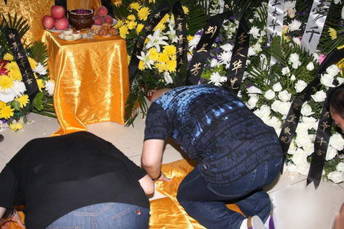 前晚剛結(jié)束人民大會堂演出的郭德綱和于謙,昨日趕到李文華的靈堂進行吊唁,并在李文華的遺像前跪拜。
