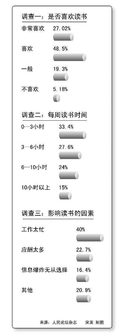 為了解干部讀書現(xiàn)狀,人民論壇雜志社近日在全國范圍內(nèi)組織了“萬名黨政干部閱讀狀況調(diào)查”。結(jié)果顯示,七成多的黨政干部讀書的愿望強(qiáng)烈,但由于工作忙、應(yīng)酬多等原因,33.4%的受訪干部每周的讀書時(shí)間為0—3小時(shí),27.6%為3—6小時(shí)。