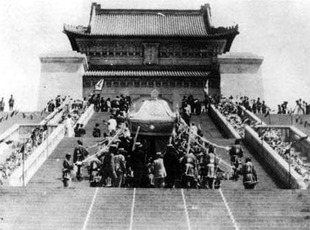 上午8時,各行列先后到達(dá)紫金山麓,由糾察員引導(dǎo)至指定地點(diǎn)肅立恭候。奉安籌備人員也將靈輿安置于石級前廣場上守候。靈輿為亭子式,用藍(lán)綢裹扎,四周懸白綢彩球。杠夫108人分別肅立在靈輿兩側(cè)等候。9時05分,巨幅遺像到達(dá)廣場,遺像前有“肅立”、“致敬”旗兩面,全體參加人員即脫帽肅立致敬。不久,各國專使、外賓也列隊(duì)到達(dá),登上第一層石級平臺恭候。9時20分靈車緩緩開到廣場,停在靈輿前。家屬下車,進(jìn)黑色布幔中肅立于靈櫬之側(cè)。國民黨中央委員、國民政府委員等送櫬人員由總指揮朱培德、總干事孔祥熙指揮,各按規(guī)定地點(diǎn)肅立。9時30分,由孔祥熙、吳鐵城、鄭洪年等率領(lǐng)杠夫10人將靈櫬從靈車上降下,移上弼輿。9時45分起杠,踏石級而上,40名樂手奏哀樂前導(dǎo),宋慶齡率領(lǐng)眾親屬等女眷在布幔內(nèi)步行送殯,執(zhí)紼人員在兩側(cè)恭扶前進(jìn)。10時08分,靈輿抵達(dá)祭堂前平臺,杠夫換用小杠抬靈櫬,宣贊員宣贊,執(zhí)紼人員恭扶靈櫬入靈堂,停于祭堂中央,肅靜片刻后,由宣贊員宣贊,舉行奉安典禮。奏哀樂后,全體行三鞠躬禮,然后獻(xiàn)花圈,讀誄文,蔣介石主祭,譚延闿、胡漢民、王寵惠、戴季陶、蔡元培陪祭。典禮完畢后,孔祥熙率領(lǐng)杠夫?qū)㈧`櫬移入墓室,孫中山親屬、國民黨中央代表蔣介石、故舊代表犬養(yǎng)毅、各國專使代表歐登科(荷蘭專使)隨同進(jìn)入墓室,率領(lǐng)杠夫?qū)O中山靈櫬奉安于壙內(nèi),靈穴上置捷克雕塑家高琪所刻孫中山先生漢白玉臥像。這時,獅子山炮臺響起一百零一響禮炮,全國民眾停止工作,默哀3分鐘,12時正,奉安完畢。在祭堂內(nèi)參加大典的人員依次進(jìn)墓門瞻仰。然后回到祭堂,全體集合,再行鞠躬禮,奏哀樂。最后,由夫人宋慶齡率領(lǐng)孫科夫婦、戴恩賽(孫中山女婿)夫婦等將墓門關(guān)閉,備極隆重的奉安大典告成。當(dāng)日,于陵下矗立一塊巨牌,上刻譚延闿所書“民國十八年六月一日,中國國民黨葬總理孫先生于此”。