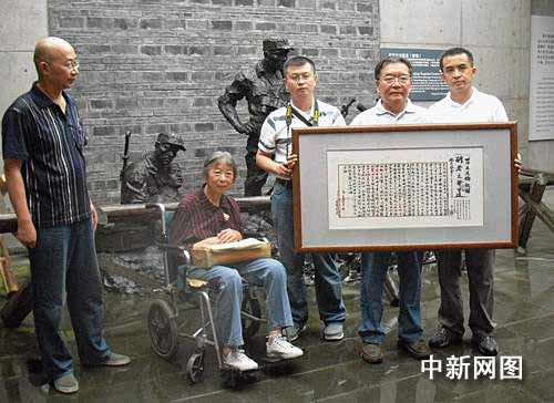 中新網(wǎng)成都7月7日電 (吳志維 楊杰) 今年7月7日是盧溝橋事變72周年紀(jì)念日。7日上午,臺(tái)兒莊滕縣保衛(wèi)戰(zhàn)鄒紹孟之遺腹子鄒汝祥來(lái)到建川博物館,將《滕縣保衛(wèi)戰(zhàn)英烈名單》、家書(shū)復(fù)制件捐贈(zèng)給該館珍藏。