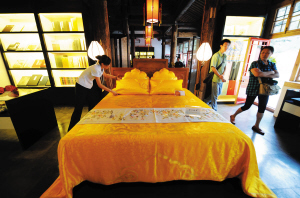東長房觀眾服務(wù)區(qū),工作人員在整理故宮特色商品,僅有一套的云錦緙絲寢具(五件套)標價888888元。與30元一碗的面相比,這套云錦緙絲寢具才是真正的天價。