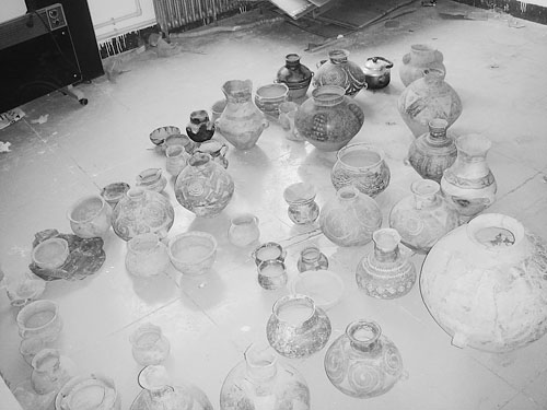 9月5日,記者以文物購買者身份來到“金剛手”家。他拿出幾件彩陶向記者介紹說,這都是從村民手上收來的。這幾件彩陶有一個(gè)直徑約10厘米的碗,外沿有條形彩繪。據(jù)介紹,這完全是沒有修飾過的出土文物,但由于花紋較普通,所以價(jià)錢不太高。還有一個(gè)很小巧的三足罐,據(jù)介紹這是破損后修補(bǔ)的,所以價(jià)錢也不貴。還有一個(gè)約10厘米高的小口罐,花紋較精美。“金剛手”承認(rèn)這是“老貨新工”,即出土?xí)r掉色了,花紋是后來畫上去的。