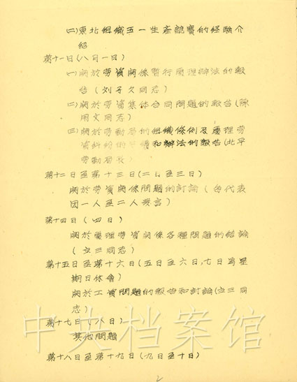 1949年7月23日至8月16日,全國工會工作會議在北平舉行。出席會議共有省、市、區(qū)72個單位的代表254名。毛澤東、朱德、周恩來等先后到會講話,李立三作了關于工會組織的報告。這次會議規(guī)定了當時全國工會工作的中心任務,就是在一年左右基本上把全國工人階級組織起來,以便在新中國的政權建設和經(jīng)濟建設中勝利地擔負起領導階級的歷史使命。會議通過了《關于勞資關系暫行處理辦法》等四個文件,明確了在新民主主義政權下處理勞資關系的正確途徑。