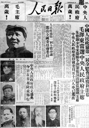 《泰晤士報(bào)》和美國的《紐約時(shí)報(bào)》、日本的《朝日新聞》等著名世界大報(bào),幾乎都在這幾天的同樣時(shí)刻,簡單地介紹了毛澤東、朱德、周恩來的生平。10月1日、2 日的日本大報(bào)《朝日新聞》還刊登了毛澤東、張瀾、朱德、李濟(jì)深、劉少奇、宋慶齡、周恩來、沈鈞儒等人的照片,但未登高崗、羅榮桓等人的照片。10月4日,《朝日新聞》報(bào)道了蘇聯(lián)承認(rèn)新中國,與國民黨政府?dāng)嘟坏南。西方媒體中,除英國報(bào)道稍為詳細(xì)外,其它國家似乎都輕描淡寫,竭力縮小這一重大事件的影響。