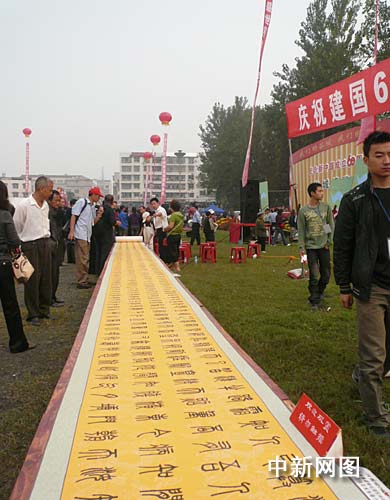 中新社襄樊9月29日電 (涂玉國(guó))長(zhǎng)一百一十米、寬零點(diǎn)八米,用五種字體書(shū)寫(xiě)的毛主席詩(shī)詞的書(shū)法長(zhǎng)卷,二十九日在湖北省襄樊市谷城縣博覽會(huì)上現(xiàn)身。這是該縣文化館副館長(zhǎng)、書(shū)法美術(shù)家協(xié)會(huì)主席許祥強(qiáng)為慶祝新中國(guó)成立六十周年而作。