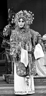 “鎧甲” 行話為“靠”,造型很像甲胄。武將扎上“靠”,表現出人物威風凜凜、氣宇軒昂的英雄氣概!榜蕖痹诰﹦》b里,屬于便服,不論哪個行當或哪種身份的人物都可以穿這種服裝。旦行的褶子為對襟,略短。褶子如繡有飛鳥、蝴蝶、花卉等圖案的稱為花褶子;沒有刺繡的稱為素褶子!班,繡有團龍團鳳圖案的黃帔,為皇帝、后妃、公主所穿;繡有鶴、鹿、牡丹、花卉等圖案的帔,為宰相、重臣、紳士、夫人等人物所穿;狀元登科和新婚拜禮時穿大紅繡花帔;一般文人學士只穿素帔。下層人物也各有專門服式。除兵卒的衣外,劊子手、龍?zhí)拙刑囟ǖ囊。漁家、堂倌、書童穿對襟粗布衣褲。還有僧人、道人穿的八卦衣、道姑衣、法衣等。包括各路神仙也有屬于各自的服飾。(職茵 整理)