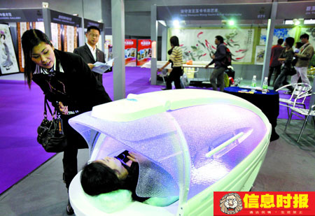 “這是家庭用的水療美體太空艙,過去只在國外流行,現(xiàn)在是在中國很流行!眮碜员本┠翅t(yī)療器械公司負責(zé)人沈麗娟說,中國人很講求私密性,到美容院做美體水療不如在家來得舒坦。這臺家用式水療美體太空艙集沐浴、水療、按摩、干溫蒸等功能于一體,內(nèi)部還設(shè)紅外線治療、LED藍光治療等,而且可以一邊做美體一邊聽音樂、睇電視。