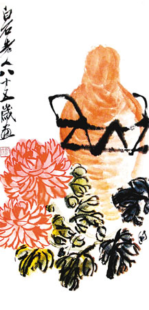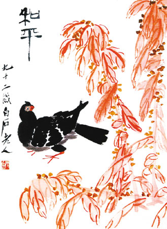齊白石以花鳥(niǎo)畫(huà)見(jiàn)長(zhǎng),他善于將民間藝術(shù)的審美情趣融進(jìn)傳統(tǒng)文人畫(huà),以質(zhì)樸率真之氣開(kāi)創(chuàng)了文人畫(huà)的新境界,畫(huà)面洋溢著活潑的生命力,極具明朗、清新之美,充滿(mǎn)了泥土的芳香。技法上,他注重用筆的蒼勁老辣與方折勁挺,筆力雄健,揮寫(xiě)自如;墨法則講究單純準(zhǔn)確,對(duì)干濕濃淡的搭配關(guān)系極力經(jīng)營(yíng);用色則大膽而濃艷,吸收民間美術(shù)的敷色特點(diǎn),卻艷而不俗;構(gòu)圖上,他多以簡(jiǎn)潔之圖,塑花、鳥(niǎo)稚拙之美,但一些作品則極力刻畫(huà)蟬、蝶、蟋蟀等小昆蟲(chóng),寫(xiě)實(shí)程度足可亂真,與大寫(xiě)意花卉相配,別具情趣。