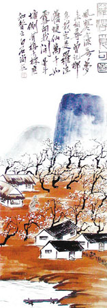 白石老人以花鳥(niǎo)創(chuàng)作為主,但也偶作山水,并能把花鳥(niǎo)畫(huà)的一些技法運(yùn)用到山水畫(huà)中,別有清新明快之感!读_浮覓句圖》是一幅精彩的山水畫(huà)作品,此作取全景式構(gòu)圖,布局宏大:遠(yuǎn)處羅浮山巍峨聳立,設(shè)色單純明快,虛實(shí)相映,凸顯空間之感;山下赭色的坡地上則是梅林如海,白梅綻放,梅香陣陣;林中屋舍隱顯,高士攜童覓詩(shī);近景水波微瀾,渡頭空曠,具有濃郁的文人情懷。該畫(huà)的技法簡(jiǎn)捷,沒(méi)有傳統(tǒng)山水畫(huà)的“勾、皴、染、點(diǎn)”的繁復(fù)創(chuàng)作程式,而是以大寫(xiě)意手法縱筆平涂,別具簡(jiǎn)約質(zhì)樸的生活情趣。在色彩上,大片泥土的赭石紅,也與遠(yuǎn)山淺藍(lán)綠的花青色形成鮮明對(duì)比,顯得非常精神。題詩(shī)“風(fēng)寒冬深無(wú)夢(mèng)來(lái),相尋曾記那年栽;定是羅浮舊蜨仙,萬(wàn)千如雪向我開(kāi)”,詩(shī)畫(huà)相配,令人心馳。