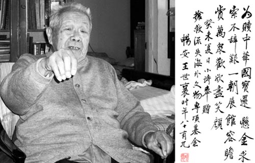 2002年搶救流失海外文物專(zhuān)項(xiàng)基金成立,邀請(qǐng)王世襄先生擔(dān)任顧問(wèn),他欣然應(yīng)允。他說(shuō),被掠奪的文物,如龍門(mén)、云岡石窟被盜掘的文物,應(yīng)該無(wú)償追回。這些文物必須歸還回原地,因?yàn)樗麄兪峭辽灵L(zhǎng)的,根在國(guó)內(nèi),是上下相連的。王世襄先生對(duì)成立一個(gè)以搶救流失文物、保護(hù)文化遺產(chǎn)的公益組織頗感快慰。興奮之余他賦詩(shī)一首:為贖中華國(guó)寶還、懸金求索不辭艱。一朝展館容瞻賞,萬(wàn)眾歡欣盡笑顏。