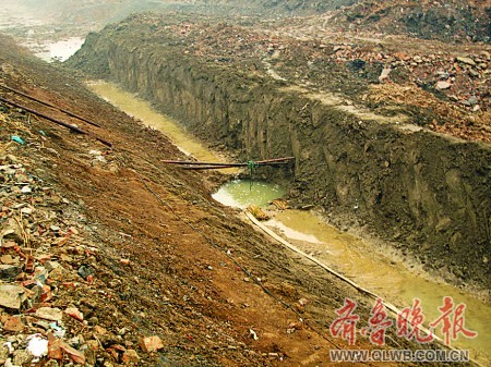 記者20日來到發(fā)現(xiàn)古墓的工地。因?yàn)橄掠,工地中一片泥濘。這個(gè)剛被挖出的宋元古墓在一條東西走向的河溝溝底,距離地面約五六米,墓口用兩根棍子示意。起初,墓穴的外形還比較明顯,隨著河溝一側(cè)的雨水向墓穴匯去,幾十分鐘的工夫便被淹沒了。