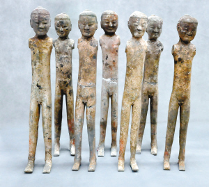 “這些陶俑與漢陽(yáng)陵的陶俑相似,大約60厘米高!睆堉倭⒄f,現(xiàn)在雖然看著陶俑都是赤身裸體,沒有胳膊,但在胳膊處都留有孔,而在坑內(nèi)專家們還發(fā)現(xiàn)了盔甲的殘片,可見這些陶俑原先都穿有各種各樣的衣服。而在坑內(nèi),出土了大量的兵器銅鏃、刀、箭等,還有十分少見的6金6銅的青銅鐘,還有做飯用的陶釜。