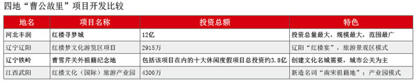遼寧鐵嶺本是《紅樓夢(mèng)》續(xù)作作者高鶚的故里,但鐵嶺順手牽羊,公開宣稱是曹雪芹的“關(guān)外祖籍”,以全市之力打造“紅學(xué)文化之鄉(xiāng)”,2008年推出的“曹雪芹關(guān)外祖籍紀(jì)念地”項(xiàng)目是鐵嶺休閑度假區(qū)的10大項(xiàng)目之一,這10大項(xiàng)目總投資約3.8億元,建設(shè)周期為2年,年均經(jīng)營收入4.3億元,投資利潤率 33%,投資回收期為3年。