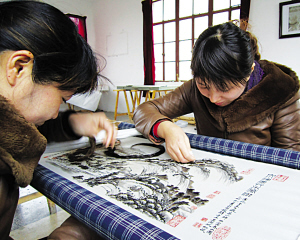 今年“兩會(huì)” 期間,溫家寶總理在記者招待會(huì)上借《富春山居圖》合璧的話題,表露了華夏兒女期盼祖國統(tǒng)一的心愿。這個(gè)信息使江蘇東臺(tái)市的工藝美術(shù)工作者大為觸動(dòng)。因?yàn)樵缭?008年,當(dāng)?shù)氐膬蓚(gè)美術(shù)師和8位繡娘歷時(shí)9個(gè)月曾制作了發(fā)繡作品《富春山居圖》,畫面藍(lán)本是原畫的后半部分《無用師卷》,這部作品在當(dāng)年的第八屆中國工藝美術(shù)大師作品暨中國工藝美術(shù)精品博覽會(huì)上獲得了金獎(jiǎng)。