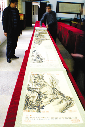 今年“兩會(huì)”期間,溫家寶總理說出了讓傳世名畫《富春山居圖》合璧的心愿。昨天,從東臺(tái)市傳出消息,該市的工藝美術(shù)工作者運(yùn)用“民間一絕”的頭發(fā)刺繡技藝,照原樣大小成功制成了一幅發(fā)繡長卷,完整再現(xiàn)了原畫的全貌,使這幅名畫分割在海峽兩岸的兩部分在發(fā)繡藝術(shù)天地里完美合璧。