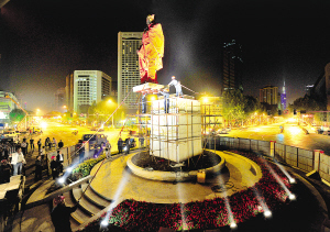 22:30,淮海路、洪武路、王府大街、長江路組成的新街口四環(huán)實施交通管制,新街口大轉盤馬上“清凈”下來。22:35,工作人員開始做吊裝前的準備工作,首先是兩臺吊裝機駛近大轉盤南北向停放,緊接著工作人員將銅像下的原有基座切割掉后,吊機開始起吊銅像,為了平衡銅像,在銅像的四邊,都有人用繩子進行牽拉,大約23:50銅像吊裝到基座上,工人開始對銅像進行固定……截至記者發(fā)稿時,銅像仍在安放中。