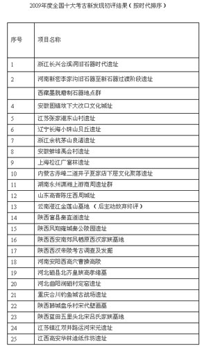 據(jù)介紹,今年的初評(píng)由國(guó)家文物局考古專家組成員、中國(guó)考古學(xué)會(huì)104位理事和63家全國(guó)考古發(fā)掘資質(zhì)單位共同投票,從60項(xiàng)候選項(xiàng)目中按得票數(shù)產(chǎn)生25個(gè)發(fā)掘項(xiàng)目入圍(名單附后),參加2009年度全國(guó)十大考古新發(fā)現(xiàn)終評(píng)評(píng)選。