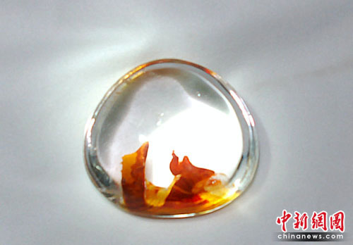 全國30多個(gè)單位的參展商帶來的珍品將整個(gè)展館擺放的滿滿當(dāng)當(dāng)。當(dāng)記者來到水晶展柜前時(shí),來自西安的張老板拿出了自己收藏了十多年的天然水晶“王者之鳳”。據(jù)他介紹,天然水晶是水受到擠壓后形成冰膜,吸取地下的氧化亞鐵和鎂元素后形成的。“王者之鳳”原產(chǎn)地為巴西,圖為一只頭戴王冠的鳳凰昂首挺胸站在山頂上,鳳尾向下飄垂,紅黃兩色代表著吉祥喜慶,極其罕見。