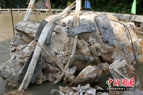 中新網(wǎng)鎮(zhèn)江6月4日電(趙國(guó)財(cái) 唐娟)4日下午,首塊《瘞鶴銘》摩崖石刻疑似殘石被巨型“勇士號(hào)”浮吊船吊起約半米后發(fā)生碎裂,首次起吊被迫終止。在打撈人員下水清理碎石后,傳來(lái)最新消息!动廁Q銘》打撈項(xiàng)目現(xiàn)場(chǎng)總指揮王雷介紹,碎裂的石頭不會(huì)對(duì)其他三塊預(yù)備打撈的石頭造成損壞。相較于首塊殘石,他更寄希望于壓在該石下面的殘石。他表示,爭(zhēng)取一周后展開第二次打撈。