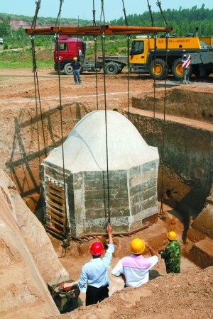 為了確保該墓成功整體搬遷,考古人員用石膏等材料在墓穴外圍做了一層防護,在墓穴東北角處搭置有一個平臺,平臺上放置了4根鐵軌作為底座,墓穴整體吊出地面后被放置其上。深坑中的墓室下方被整體架起,墓室成為一個可以移動的整體,然后由吊車進行搬遷。