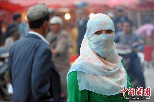 在喀什老城高臺民居,維吾爾族老人、婦女和孩子的臉上和眼睛里透出祥和、安逸;喀什街頭的烤串、馕、水果處處皆是。維族婦女身穿長袍、頭戴紗巾遮面而行,迷人的眼睛顯得十分神秘,在都市形成一道耀眼的風景。