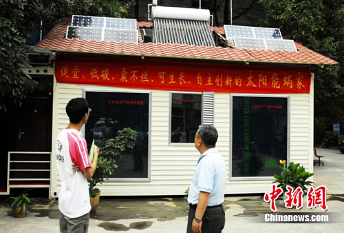 記者看到,這間鋼架結(jié)構的房屋功能齊備,雖只有10余平米,但衛(wèi)生間、沐浴間、客廳、臥室一應俱全。該房子的主人、退休工程師朱培世告訴記者,房子是由他和團隊成員花了10個月左右的時間完成,屋頂上裝有4大塊太陽能板,屋內(nèi)的熱水、通風、照明、供暖、甚至降溫都由這幾塊太陽能板提供的能量完成,是一座名副其實的太能房屋。其方倉建筑、儲冷降溫、太陽供暖、多功能窗、電池支架還獲得國家專利。