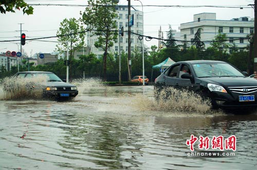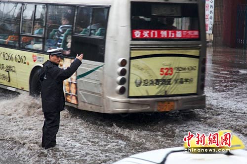 上午9時,武漢市京漢大道武勝路口出現(xiàn)漬水,最深處積水達40cm,一些小轎車駕駛員由于不了解漬水深度盲目行車而致機動車熄火。因該路段過往車輛頻繁,漬水容易造成道路堵塞,一些民警站在水中充當路標,為車輛安全行走引導方向。