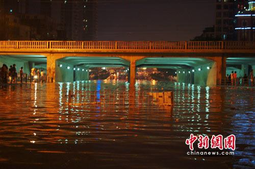 13日晚9時左右,記者來到武漢市江漢區(qū)新華下路沿線,人行道上漬水已達30厘米左右。其中,5米高的鐵路橋涵洞被淹去近半,最深積水處超過2米,整條道路交通基本癱瘓。許多市民在經(jīng)過此路段時,不得不卷起褲腳、提著鞋子涉水通過。