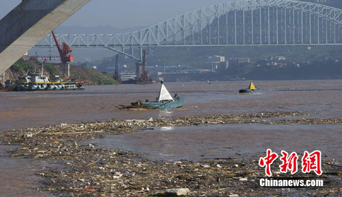 中新網(wǎng)重慶7月21日電(郭虹 朱治宇)21日,成片的渣草隨著洪峰流入長(zhǎng)江萬州水域,幾乎占據(jù)了半個(gè)江面。記者看到長(zhǎng)江重慶航道局的4艘航標(biāo)艇在江面不停穿梭,清理懸掛在航標(biāo)上的渣草。