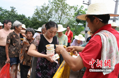 中新網(wǎng)廣安7月22日電( 廖小兵 劉長河)在剛剛遭受160年未遇的特大洪災(zāi)中,四川省廣安區(qū)肖溪鎮(zhèn)老街被整體淹滅,街道清淤還未結(jié)束,1000余人無家可歸。目前災(zāi)民生活得怎么樣?22日中午12時(shí)許,記者來到肖溪鎮(zhèn)中心街下段的災(zāi)民集中安置點(diǎn),只見兩排帳篷整齊地排列,在第三號帳篷,災(zāi)民杜超華一家正在吃著香噴噴的盒飯。“洪水來得太猛了。比三年前的洪災(zāi)高了2米多,我家的東西全部被洪水沖走了。幸虧黨委政府及時(shí)伸出了援手,給我們搭建了帳篷,購置了被褥,免費(fèi)提供一日三餐。晚上還給我們送來了蚊香。盡管受了災(zāi),有了黨委政府的關(guān)愛,我們的家園一定會迅速重建起來!
