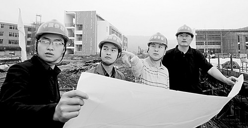 。學(xué)校建成后可容納5200名學(xué)生在校學(xué)習(xí)。今年9月1日,北川中學(xué)校園將正式交付使用。圖為施工現(xiàn)場的工程技術(shù)人員。