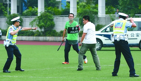15時(shí)07分,一輛警車(chē)開(kāi)進(jìn)操場(chǎng),8名全副武裝的飛龍突擊隊(duì)員跳下車(chē)門(mén),迅速包圍操場(chǎng)中央圓弧。他們身穿多功能戰(zhàn)術(shù)背心,頭戴防彈頭盔,手握沖鋒槍?zhuān)笸韧鈧?cè)還佩戴著手槍!胺畔聝雌鳌,一名突擊隊(duì)員通過(guò)擴(kuò)音設(shè)備兩次喊話(huà),但兩名持刀男子拒不就擒。