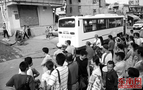 住在路邊四樓的周小姐目睹了車禍發(fā)生的經(jīng)過(guò)。她告訴記者:“當(dāng)時(shí)我正站在陽(yáng)臺(tái)邊梳頭,大約7:50的時(shí)候,一輛大客車從西邊開過(guò)來(lái),車速不是很快。開到我樓下時(shí),我看到車撞到了一個(gè)小女孩和一個(gè)老人,然后車子又繼續(xù)往下開,緊接著撞到一前一后兩名婦女,又撞到一名騎著三輪車的男子,最后左轉(zhuǎn)彎停下了!