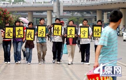 昨日上午,幾個來自中原工學院的大學生舉著“恪守真情為我真愛”的牌子出現在紫荊山廣場附近,他們選擇年輕人,特別是年輕情侶密集的地方活動,并請求他們在自己準備好的橫幅上簽名,支持自己“把第一次留給自己最愛的人”的觀點。