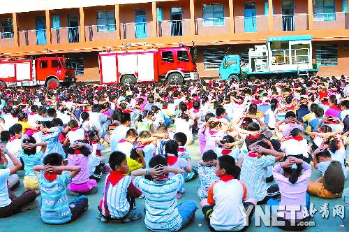 “發(fā)生地震了,如果來不及跑出教室,就立即躲到桌子下面或抱頭蹲到承重墻下,等短暫的地震過后,再迅速撤離教室。如果在衛(wèi)生間內(nèi)要找墻角抱頭蹲下!毙W(xué)生們在消防官兵指導(dǎo)下,都作出同樣動作,在操場演練地震時逃生技能!耙郧安恢赖卣鹗鞘裁礃拥耐Γ拇ǖ卣鹨院笪覀儗W(xué)校老師也講了關(guān)于地震的好幾次課。”四年級的雯雯說,她學(xué)會了“抱頭在桌子或者承重墻下面蹲下”的避震知識,回家要告訴爸爸媽媽。