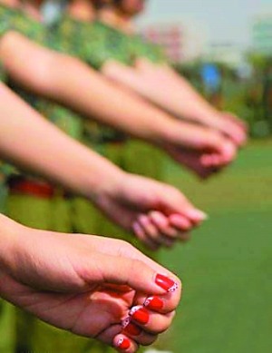 而從圖片中還可以看到,有的學(xué)生別出心裁地進(jìn)行了美甲,有的則對(duì)短袖的軍訓(xùn)服裝進(jìn)行改良——加裝了一對(duì)白色的袖套……