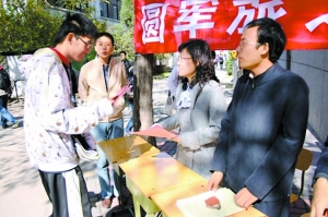 食堂門前的征兵現(xiàn)場(chǎng),一位大一新生說:“我剛參加完軍訓(xùn),太有意思了。但軍訓(xùn)時(shí)間太短,不過癮。我們的教官說,現(xiàn)在的兵營和以前大不一樣,有很多高科技的東西。所以我想報(bào)名參軍!