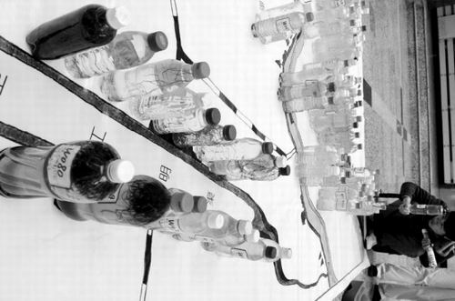 我們每天呼吸到的空氣,被裝進了藍色的氣球里,高高地飄在地圖的最上面。它代表著沈陽市的藍天。氣球下面用透明的繩子拴著幾十張照片。仔細一看,這些照片有渾河沿岸美麗的風光、有夕陽、有綠樹,有老人垂釣、有兒童嬉戲,也有學生們拿著瓶子取水樣的場景。而在地圖的最下方,則是一張平面的手繪渾河、衛(wèi)工明渠等沈陽水質圖。圖的上面擺放著大小不一的塑料瓶,瓶里裝著學生們采來的水樣。
