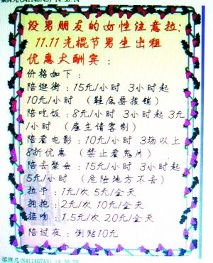 光棍節(jié)向大學(xué)“女光棍”開(kāi)放的男生“招租”廣告。
