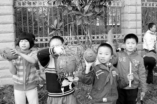 孩子們挖上來(lái)的番薯不但數(shù)量和體積相當(dāng)驚人,連形狀也是千奇百怪。除了經(jīng)常能見(jiàn)到的長(zhǎng)形的、橢圓形的番薯外,還有圓滾滾的,甚至是波浪形的,孩子們給這些番薯都取了名字,“絲瓜番薯”、“方便面番薯”,當(dāng)然,最大的“番薯王”也有名字,叫做“地雷”。