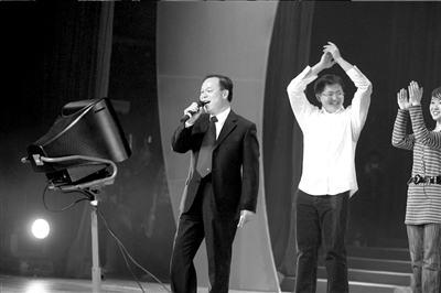 略顯緊張的周校長“喝口水”的要求得到滿足后,便從衣袋里掏出一張寫有歌詞的白紙,正式開唱。他手握麥克風(fēng),緊盯臺上的卡拉OK屏幕,高潮處他還會踮起腳尖“飆高音”。此時,上任校長許智宏微笑著坐在臺下,隨聲輕和。
