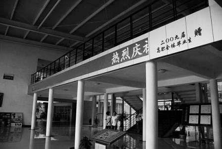 昨天下午,記者來(lái)到位于寧波市環(huán)城北路的教育學(xué)院。走進(jìn)教學(xué)樓大廳,正上方鑲嵌著一塊大約十來(lái)米長(zhǎng),半米寬的電子顯示屏,屏幕的右邊則鑲嵌著 “二00九屆高職全體畢業(yè)生贈(zèng)”的金字。