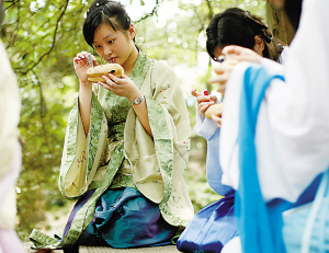 現(xiàn)場組織者玄翎(網(wǎng)名)告訴記者:“乞巧是古人一種儀式,乞巧的含義就是向織女乞求一雙巧手,女子將線穿過七個針眼的過程也是一個祈福的過程!被顒又,女孩們還學(xué)習(xí)整衣冠行漢禮,從提裙跪坐,到跽,再到拜,直至禮成。 (圖片均張春海攝)