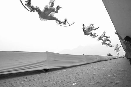 昨天,記者驅(qū)車趕到登封。雖然剛集訓(xùn)完,在塔溝武校的訓(xùn)練場上,220名學(xué)員仍馬不停蹄地訓(xùn)練。在一面寬50米、長60米的巨幅國旗下,“彈跳小子”們身輕如燕,姿勢優(yōu)美(如圖)。