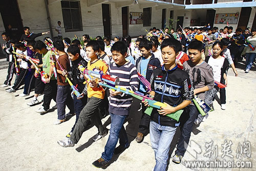 荊楚網(wǎng)消息 (楚天都市報(bào)) (記者張皓 攝影:記者魏錸)昨日下午,武漢市第59中學(xué)上百名學(xué)生,手持各式“槍支”在學(xué)校操場(chǎng)上走正步,體驗(yàn)“閱兵”的感覺(jué)。據(jù)介紹,該校最近嘗試新課改,將美術(shù)課與軍訓(xùn)、體育鍛煉結(jié)合進(jìn)行,這些槍支是在近兩個(gè)星期的美術(shù)課上,同學(xué)們利用紙盒等廢棄物自己動(dòng)手制作的。
